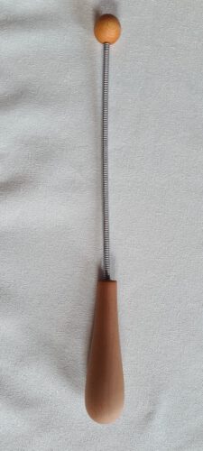 Diese Spiralfederrute besteht aus einem hochwertigen, handgedrechselten Griff aus Birnen- oder Olivenholz, einer Kugel aus Buchenholz und einer Spiralfeder aus Stahl.